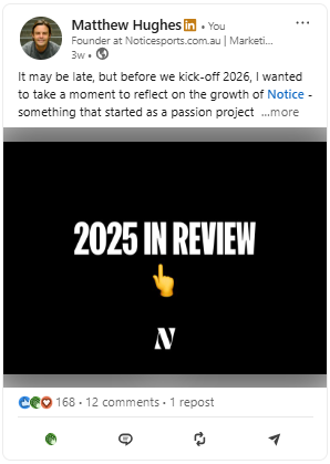 Since launching as a passion project in 2023 Notice has since evolved into something much more - a fast-growing, industry leading Australian sports business media platform boasting content that’s read by thousands of Australian sports industry professionals weekly.