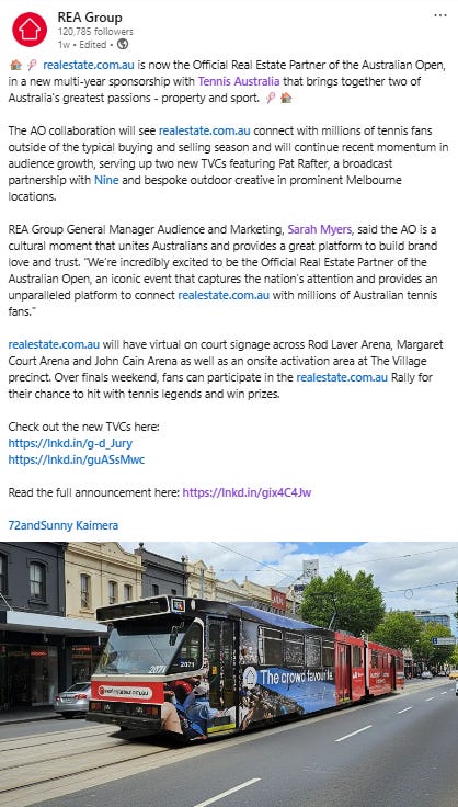 Realestate.com.au - was unveiled as the Official Real Estate Partner of the AO as part of a new multi-year deal - REA launched a bespoke campaign (including 2 x TVCs featuring Pat Rafter) which is set to feature across broadcast, print, digital, Melbourne Park and OOH/high-traffic areas across Melbourne