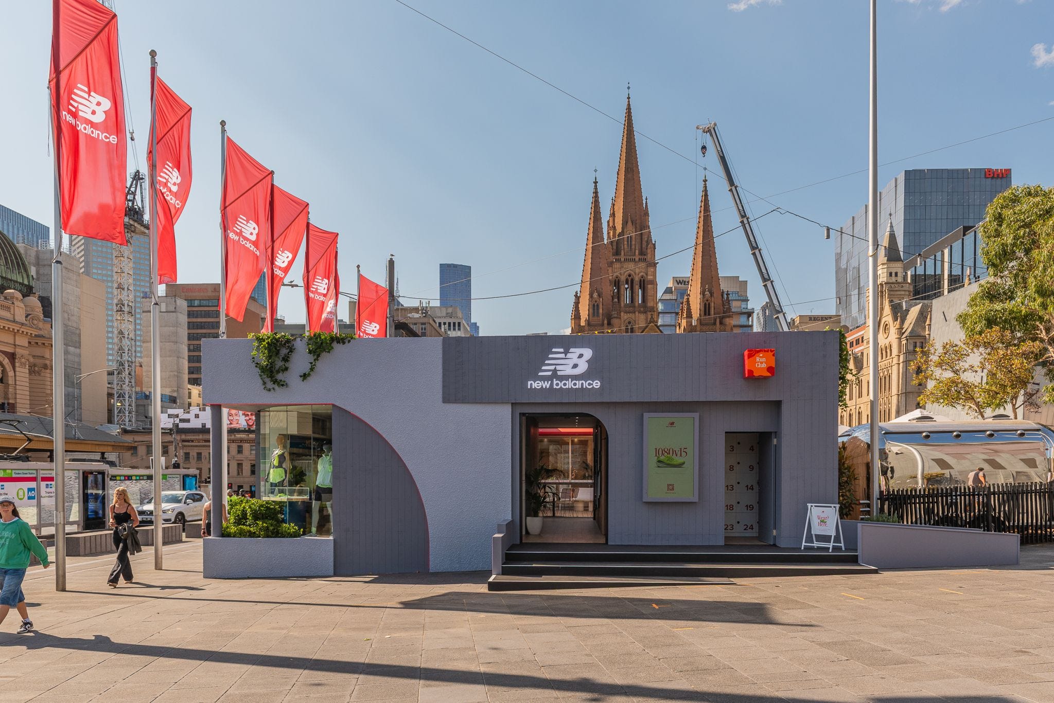In addition to product launches and experiential activity, New Balanced-branded out-of-home advertising has blanketed Melbourne with tram wraps, rail signage, rotating digital screens, and a five-story LED display.