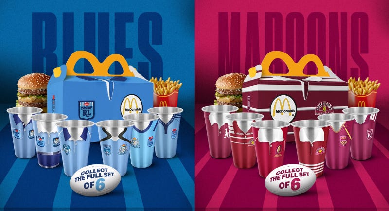 As sponsors of both the NSW Blues and Queensland Maroons, Maccas has created bespoke meals that are available in NSW and ACT restaurants for Blues fans, and in Queensland and the Northern Territory for Maroons fans.