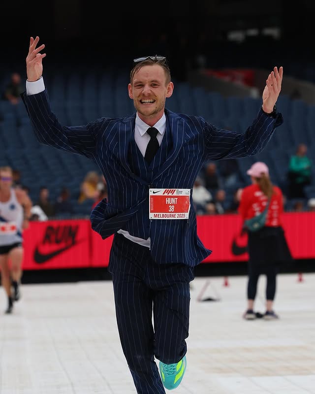 Jason Hunt ran the Melbourne Marathon in 2:38:21— in a custom, three-piece InStitchu suit to raise money for Movember.