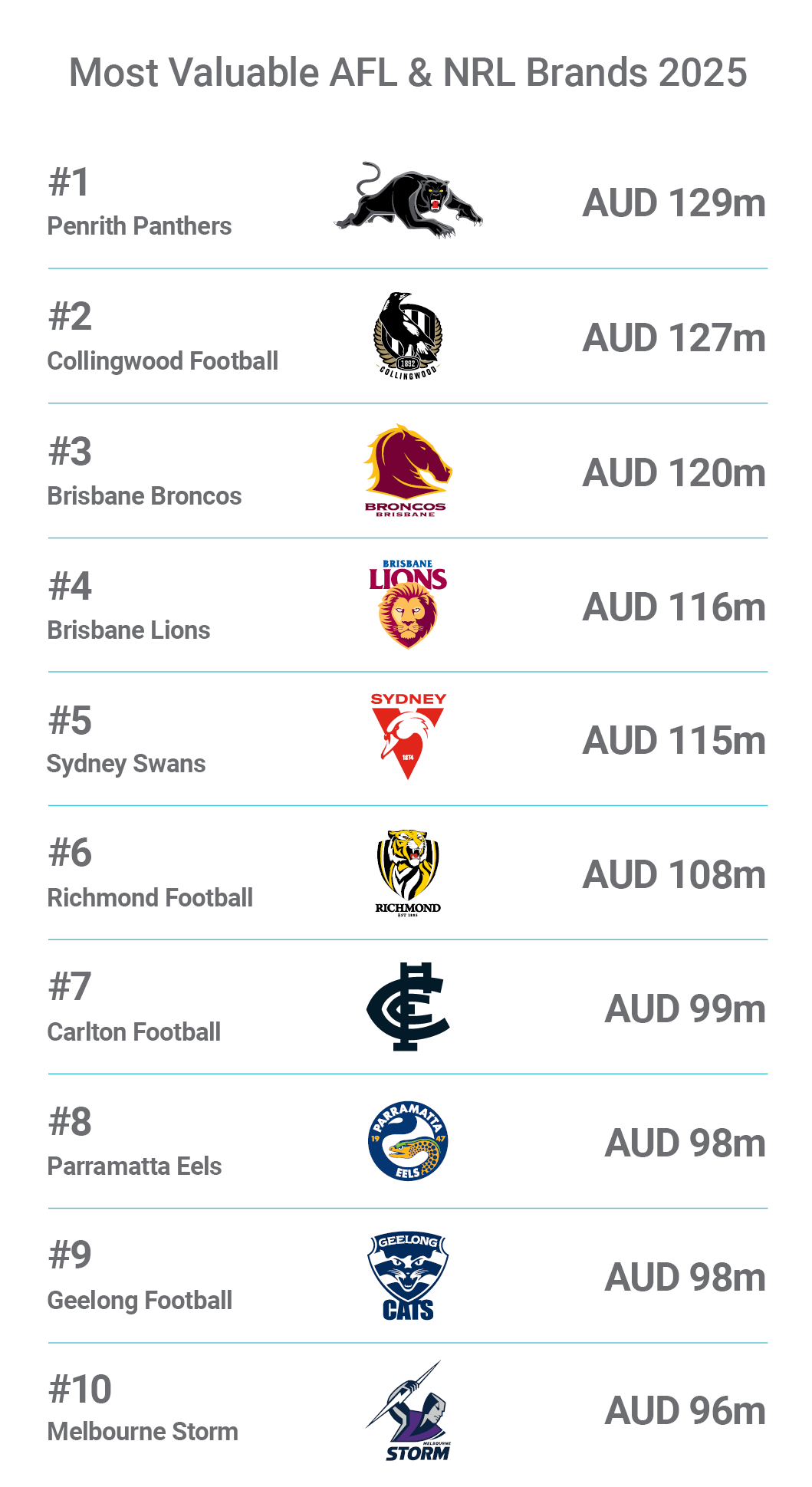 According to Brand Finance Australia, the Penrith Panthers ($129m) have taken over as the most valuable sports club in Australia, outranking Collingwood FC ($127m) and Brisbane Broncos ($120m)