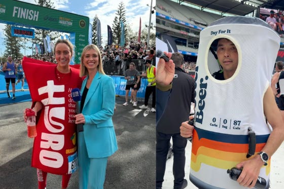 When your budgets don’t stretch to having grand pop-up’s you have to get creative! Both Better Beer and hydration brand Hyro stole attention on race days, getting their mascot seen the whole way along the 42.2km course.