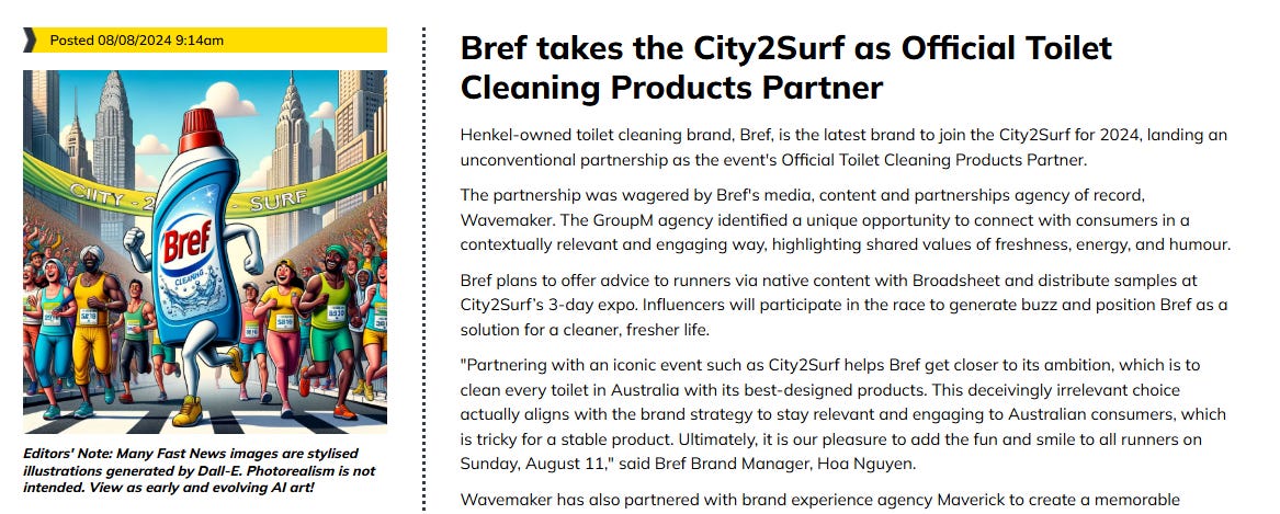 Bref…a toilet cleaner did just this. It’s their second year sponsoring city2surf - city2surf is the biggest fun run, and Bref is making runs fun. Handing out products at the expo, leaning into runners nervous conversations and even setting up a ‘poo-dium’ in 2024. They tapped into humor, they had a role and they made a low-involvement brand unexpectedly relevant.