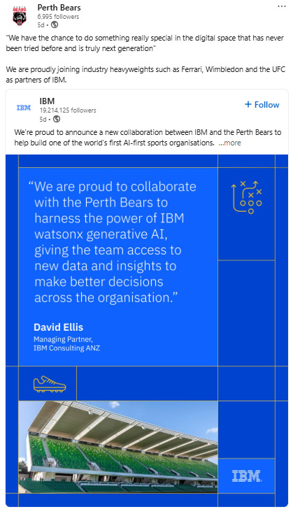 In late 2025, the Perth Bears and IBM announced a landmark Australian-sporting first collaboration where the NRL club and global technology giant will work together on AI and digital innovation.