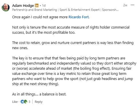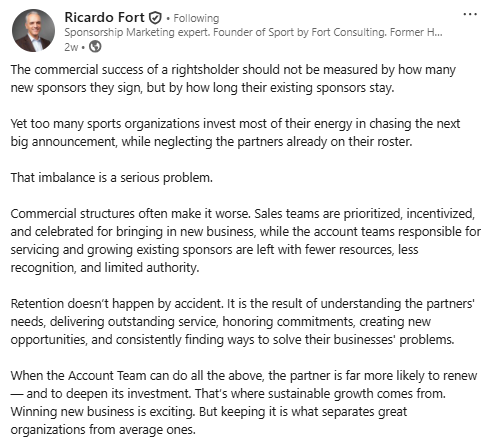 Former Coca-Cola and Visa sponsorship lead Ricardo Fort sparked this debate on LinkedIn recently, noting that too many organisations chase the next announcement while neglecting current partners.