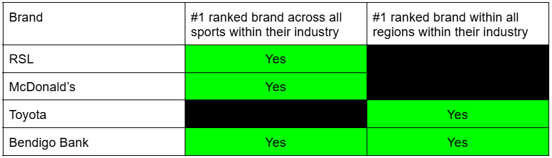 Within community sport, Bendigo Bank bucks the trend as the #1 brand for 100% sports and 100% regions.