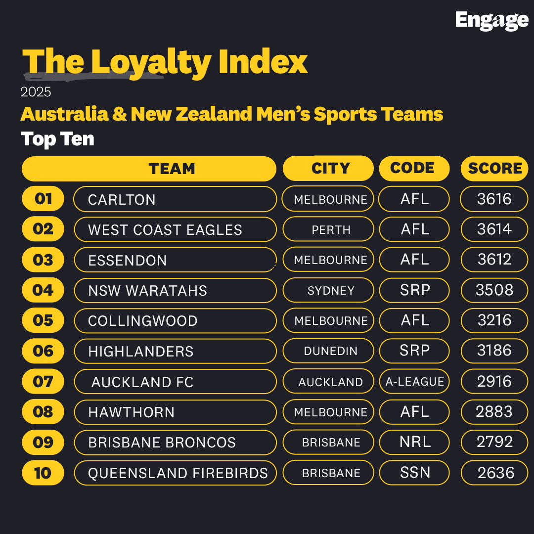 The Loyal Fans Index, developed by fan engagement specialists Engage Digital Partners, is an attempt to do exactly that. It is the first index of its kind across Australia and New Zealand men’s sport, built to measure not just how big a fanbase is, but how it behaves relative to its environment.