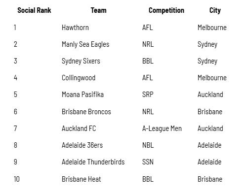 Suncorp Super Netball also sees a franchise make the top 10 in the form of Queensland Firebirds, making Brisbane the only other city alongside Melbourne to see more than one team feature in the top 10.