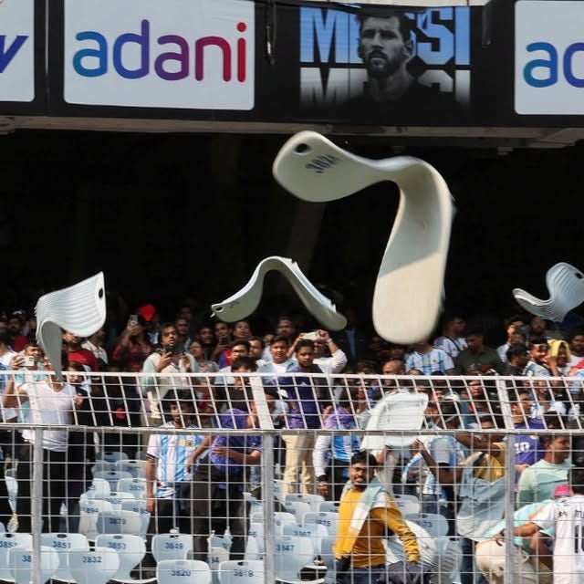 Lionel Messi’s tour of India kicked off chaotically after his scheduled for a 45-minute visit to Kolkata’s Salt Lake Stadium only lasted 20 minutes - fans threw objects, ripped up seats and invaded the pitch