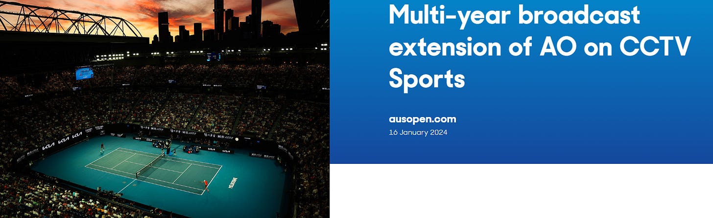 In 2024, Tennis Australia and China Media Group (CMG) announced an extension of their long-term broadcast partnership that is seeing CMG’s CCTV Sports platforms continue to broadcast the Australian Open in China on free to air television until 2026.