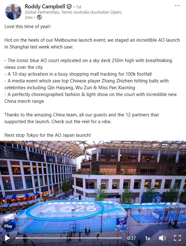 What the Australian Open is building in China is not a short-term activation play, but a compounding growth engine - a self-reinforcing ecosystem where Chinese fandom, visibility and commercial value continuously feed each other.